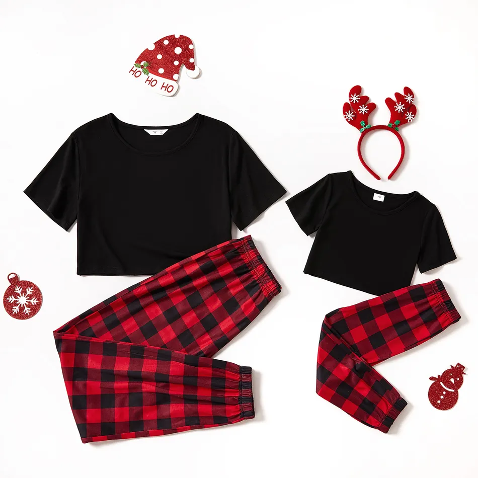 Christmas Short-sleeve Crop Top and Red Plaid Pants Sets for Mom and Me